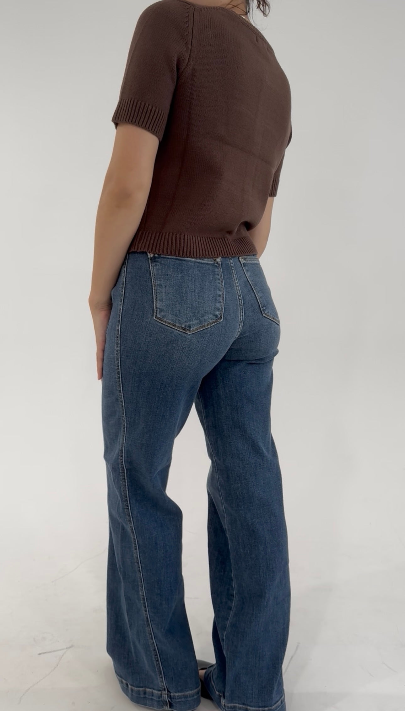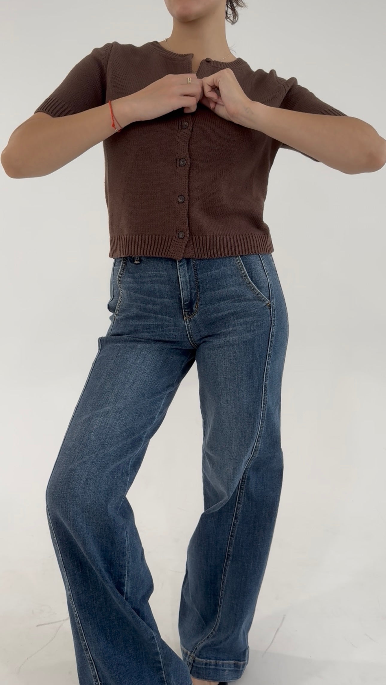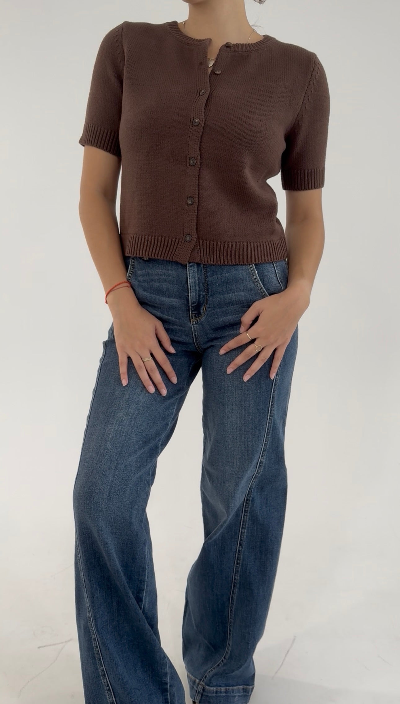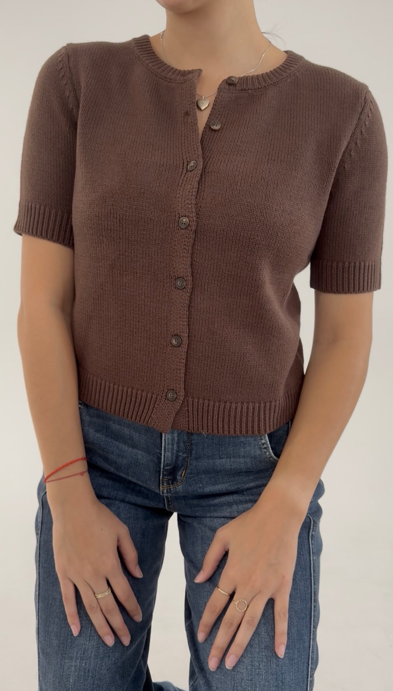 Available in rich, classic hues like crimson red, espresso brown, charcoal black, and soft slate grey, each features a flattering crew neckline, ribbed trim, and delicate tortoiseshell-style buttons that add a hint of heritage appeal. The cropped silhouette makes it ideal for pairing with high-rise jeans, trousers, or pleated midi skirts.