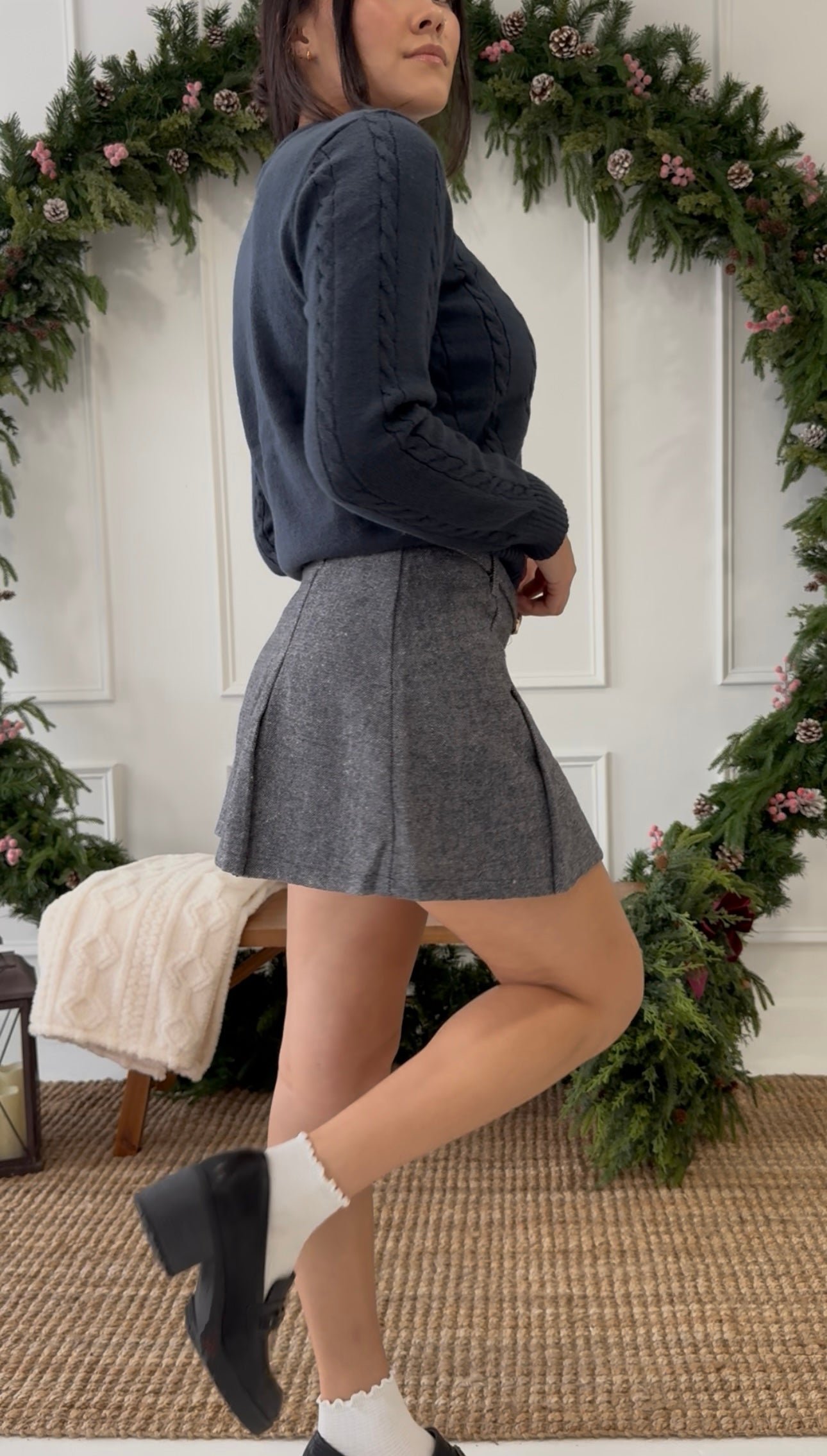 Classic charm meets modern sophistication with the Elmwood Belted Mini Skirt — a timeless piece designed to elevate your cool-weather wardrobe. This chic gray tweed mini features a tailored silhouette with subtle pleating and a front buckle detail that adds a touch of polish to every outfit. The soft woven texture gives it that perfect blend of structure and comfort, making it ideal for layering through the seasons.