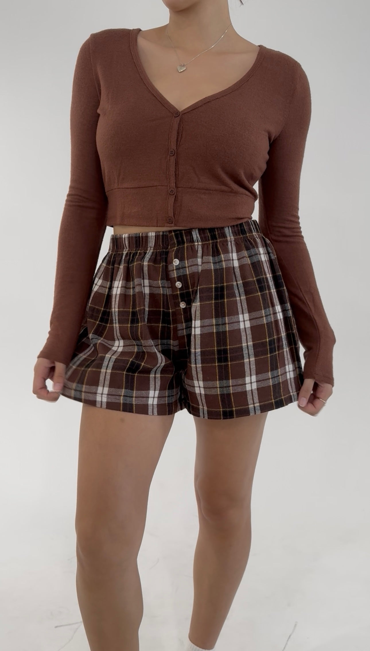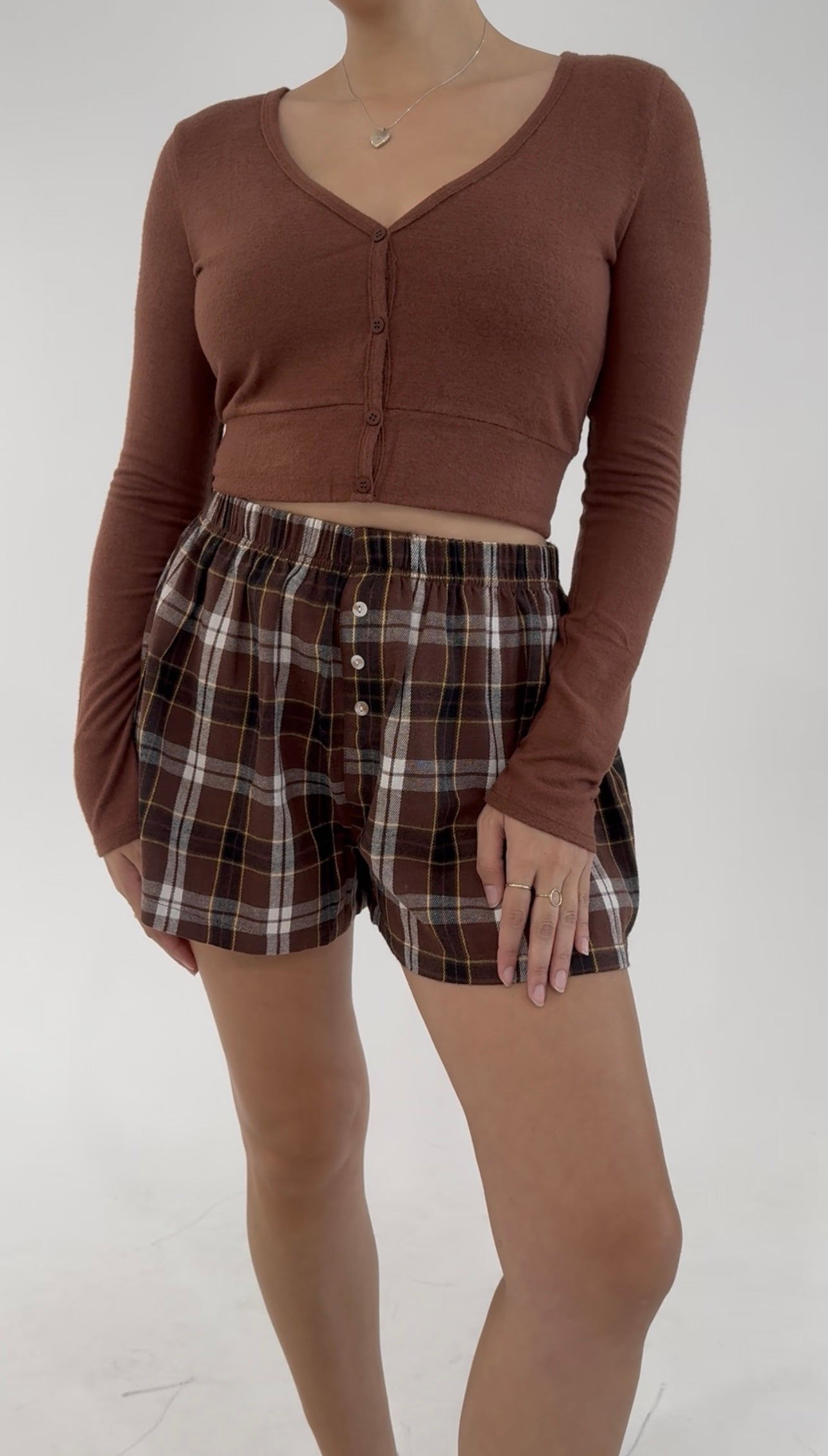 The Campfire Cutie Shorts are made for crisp mornings, cozy nights, and everything in between. Featuring a soft flannel fabric in a rich brown plaid, these laid-back lounge shorts are the perfect blend of rustic charm and everyday comfort.