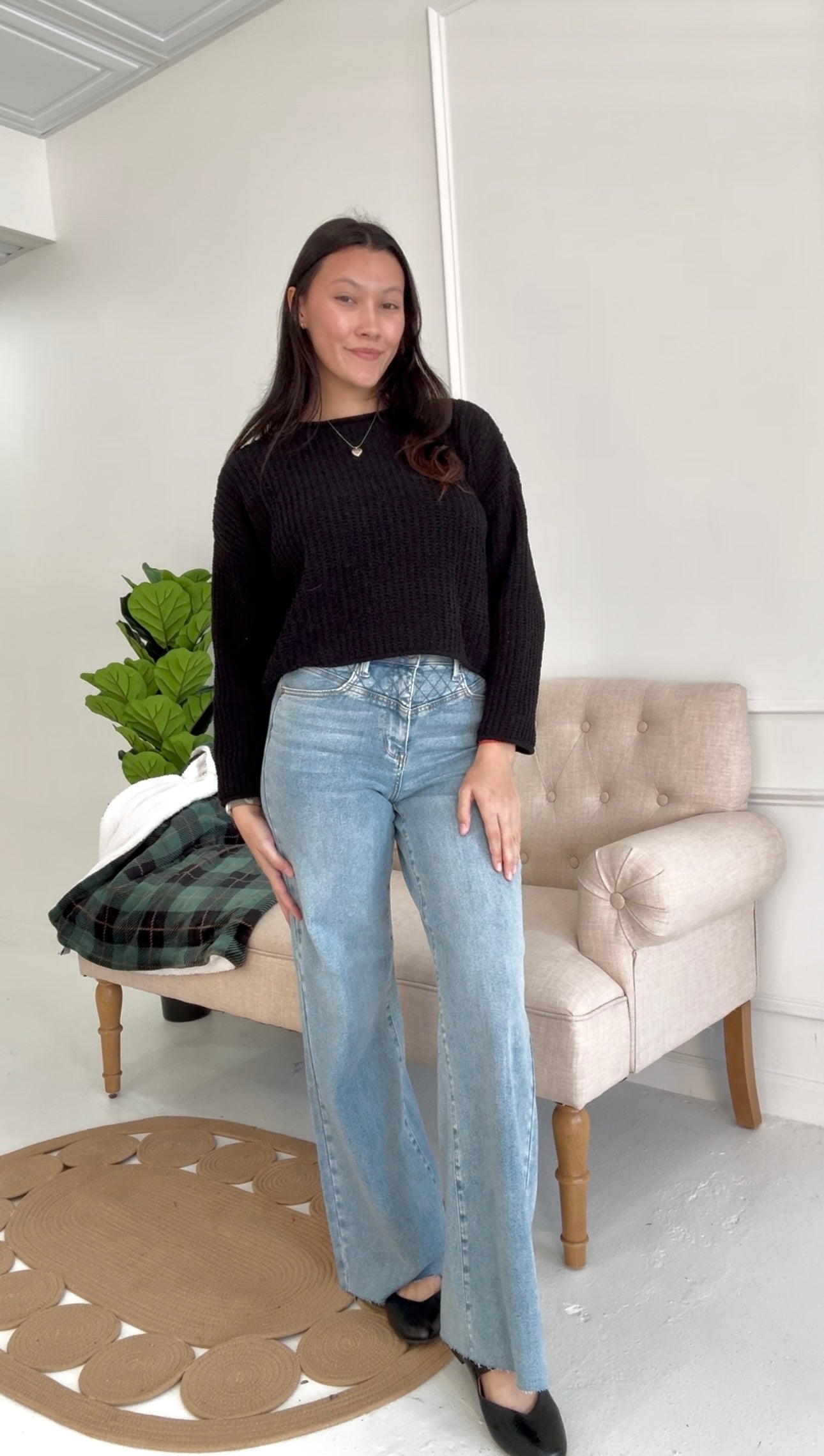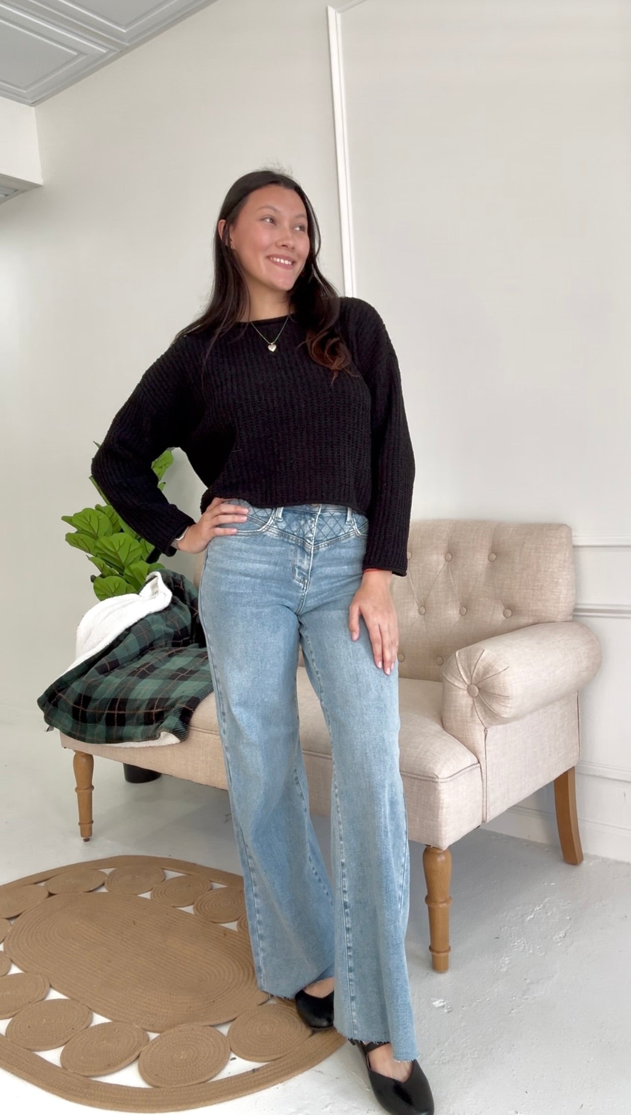 Whether you’re styling them with a tucked-in graphic tee or dressing them up with a silky blouse, these retro wide-leg jeans offer endless outfit potential. The subtle fading and clean hem give them a lived-in look while maintaining their boutique-level polish.