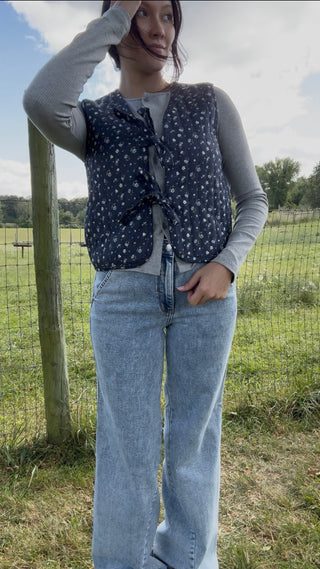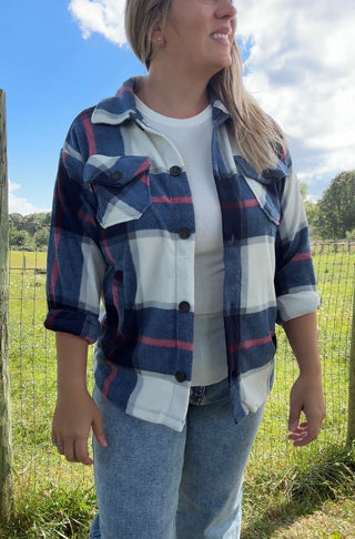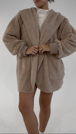 Navy blue faux-fur hooded coat with a relaxed fit, styled over a white top and light-wash jeans for cozy-chic autumn layering.