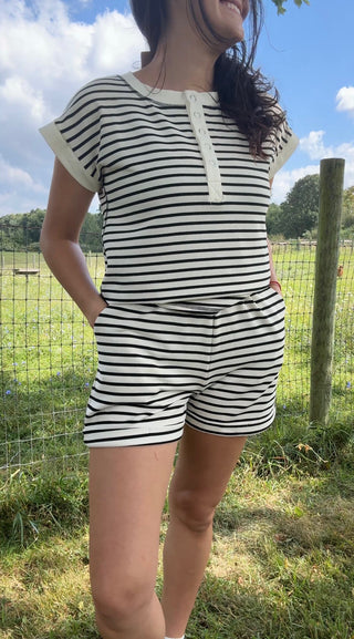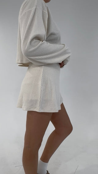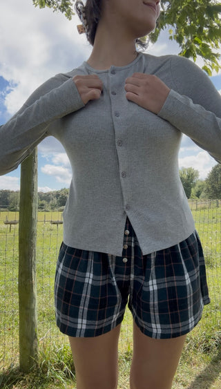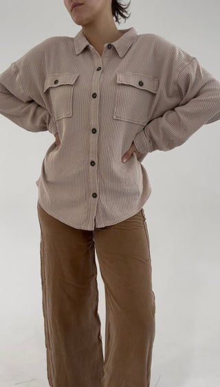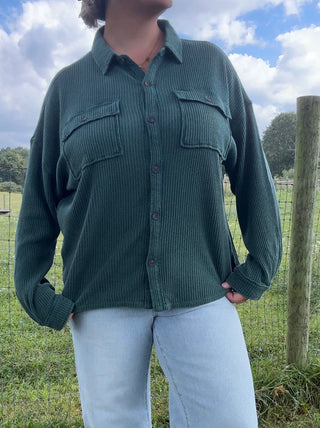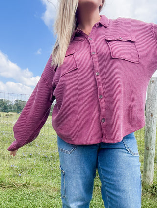 Burgundy corduroy short overalls layered over a sheer floral mock neck top in warm autumn hues.