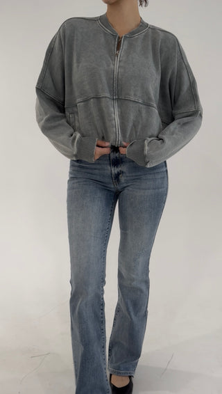 Burnt orange sweatshirt with plaid patchwork accents on the sleeves and front, styled with classic blue jeans for a cozy fall vibe.